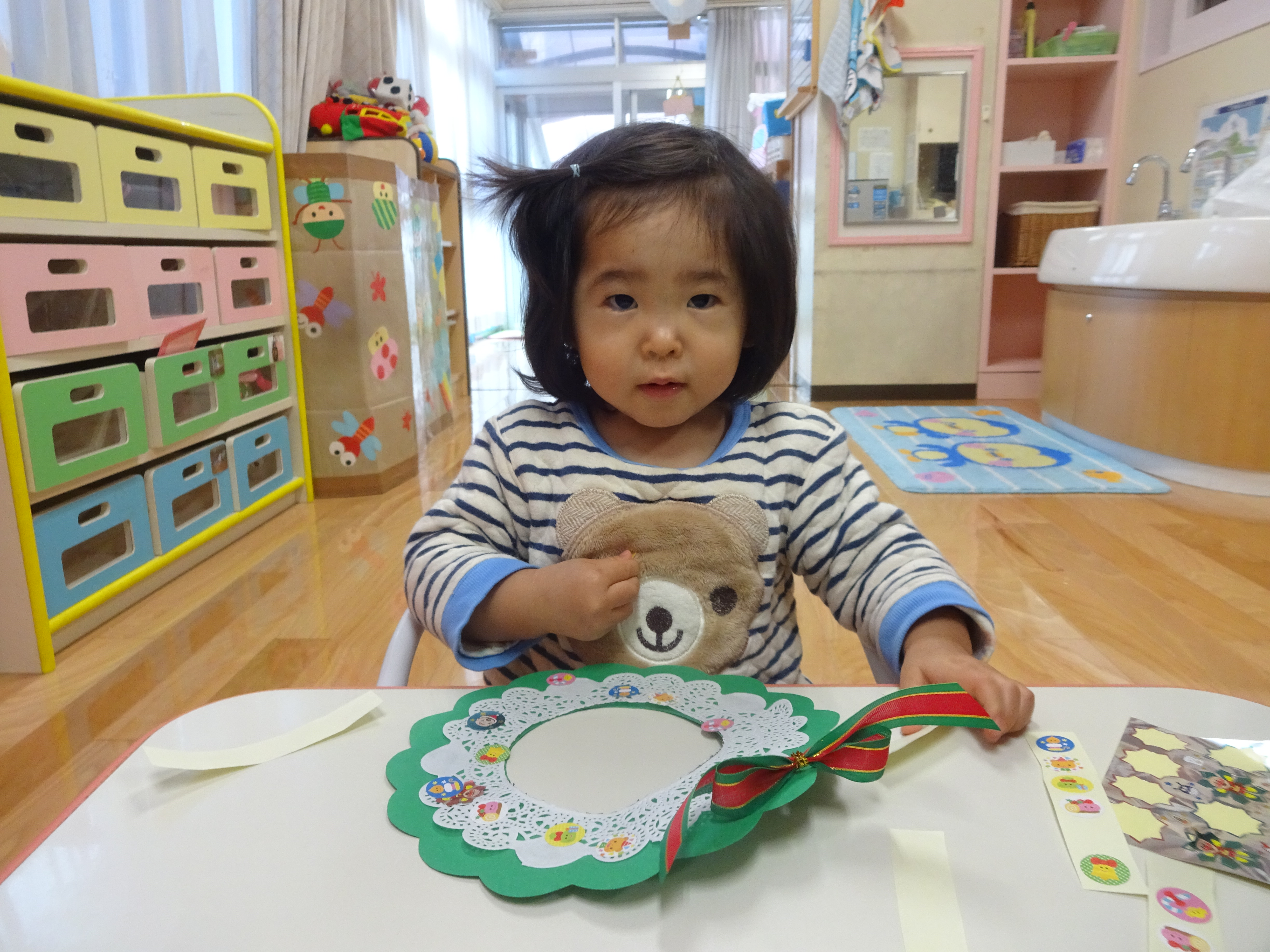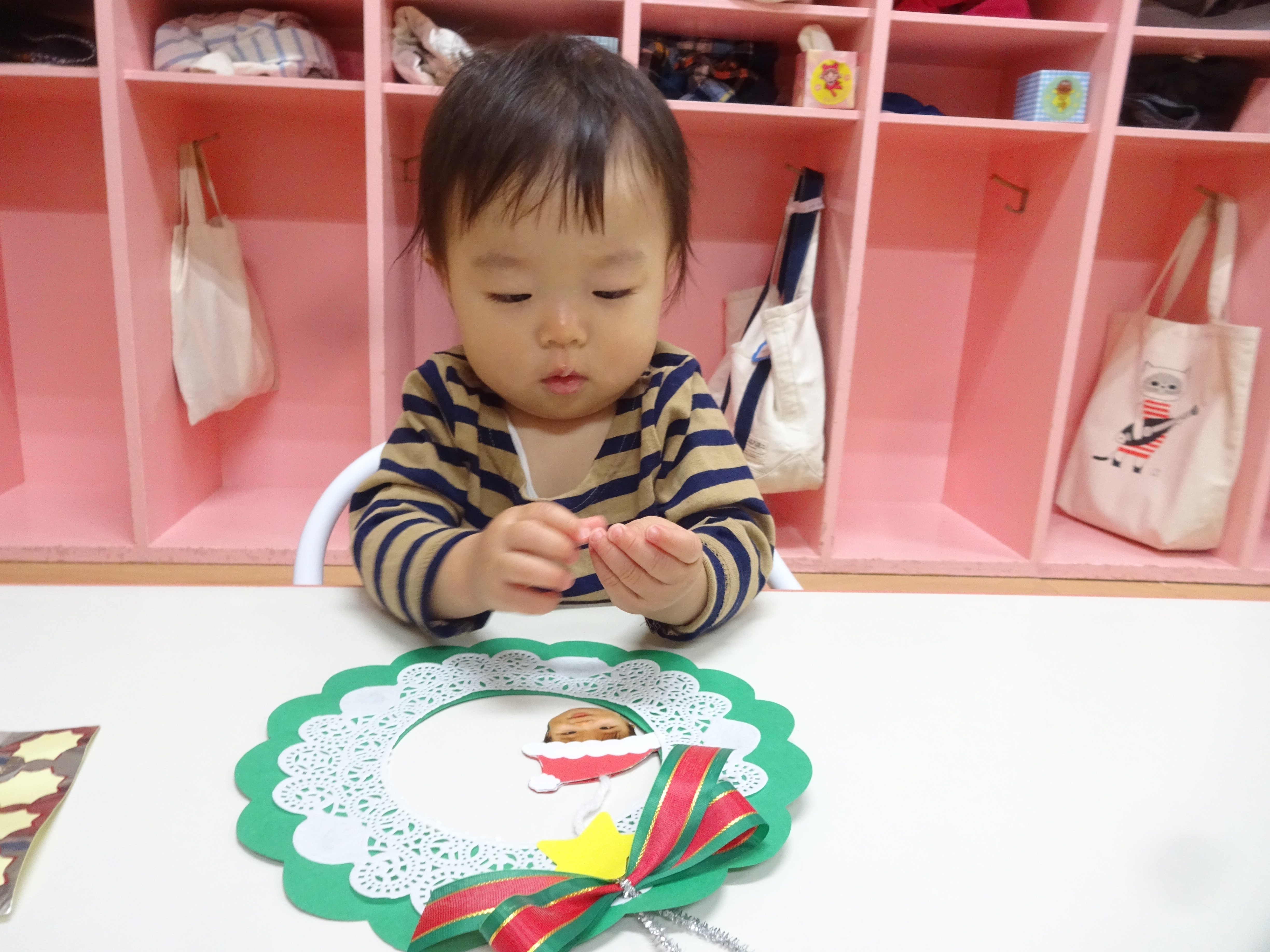 ♬ぺったん♪ぺったん♬とみんなで言いながら、大好きなシール貼りを楽しんでいました(^^♪シールを貼ったリースに可愛いサンタさんを付けて、素敵なクリスマス☆リースが完成しました❕❕