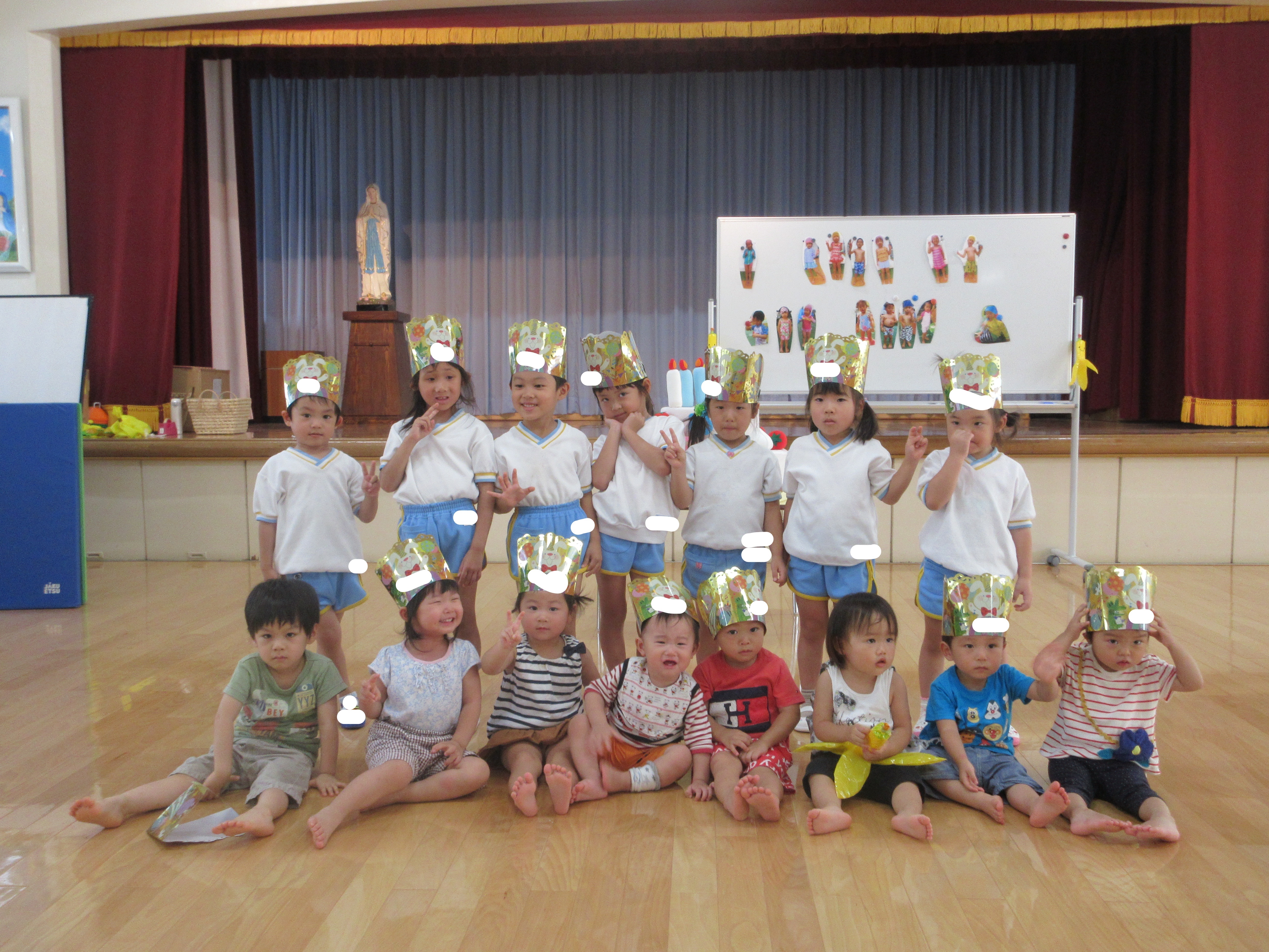 8月20日に7月8月9月のお誕生会がありました。15名のお友達がみんなにお祝いしてもらいました。オープニングは、園長先生やそら組さんがステージで片足バランスを披露してくれました。みんなヨロヨロしながらも頑張りました。今回のお誕生会のテーマは、バナナでした。バナナの妖精さんが、お誕生児のお友達を紹介したり、「とんでったバナナ」のパネルシアターを披露してくれて、みんな楽しそうでした。最後にローザの可愛いアイドルが、「とんでったバナナ」を踊ってくれて、大盛り上がりでした☆