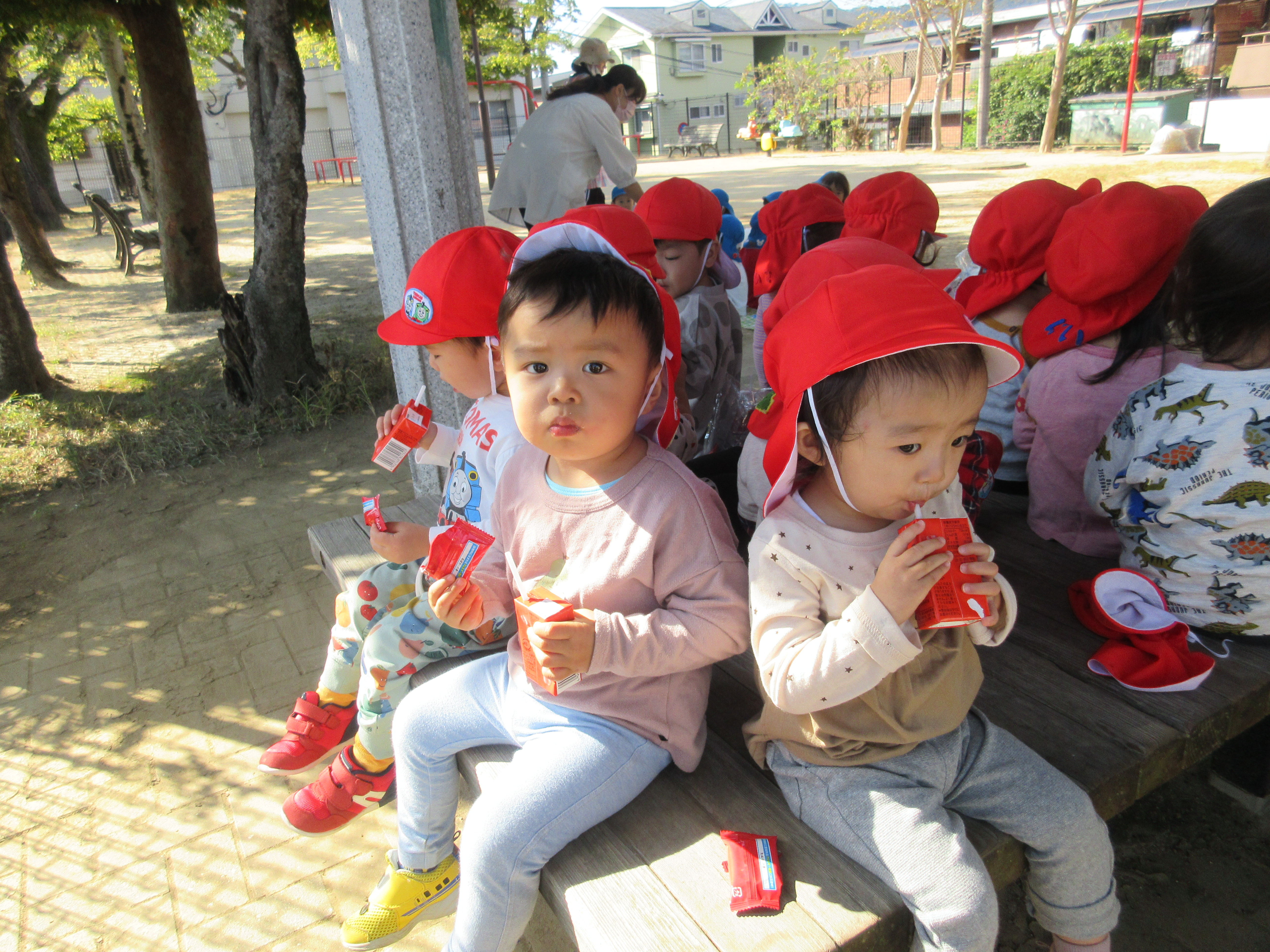 10月26日は秋の遠足の日。未満児クラスは上野町公園へ。朝のおやつを公園で皆で一緒に食べました(^^)公園で食べるおやつは特別感があり、子どもたちも嬉しそうでした♬ 以上児クラスはあぐりの丘へバスに乗っていきました!(^^)!
