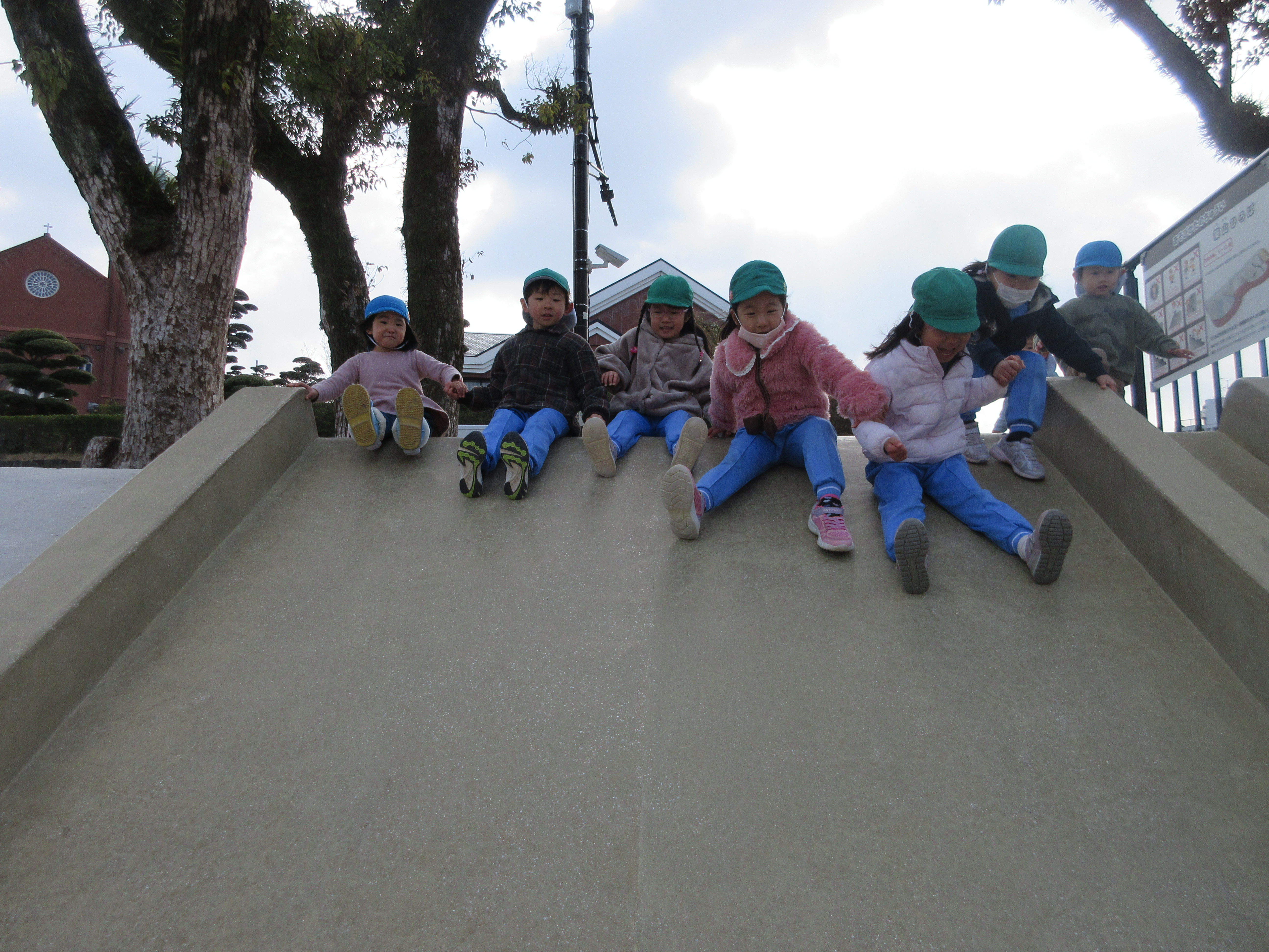 2月22日(火)にそら組さんと一緒に天主公園にお散歩に行きました♪お兄ちゃん、お姉ちゃんと一緒に手を繋いで歩くことが大好きな子どもたちは長い道のりも楽しく歩けました(^▽^)/ 公園では、滑り台を一緒に滑ったり、ブランコに乗せてもらったり…ふれあいながら、思いっきり体を動かして遊び、寒さも吹き飛ぶくらい子どもたちも楽しんでいました(*^^*)